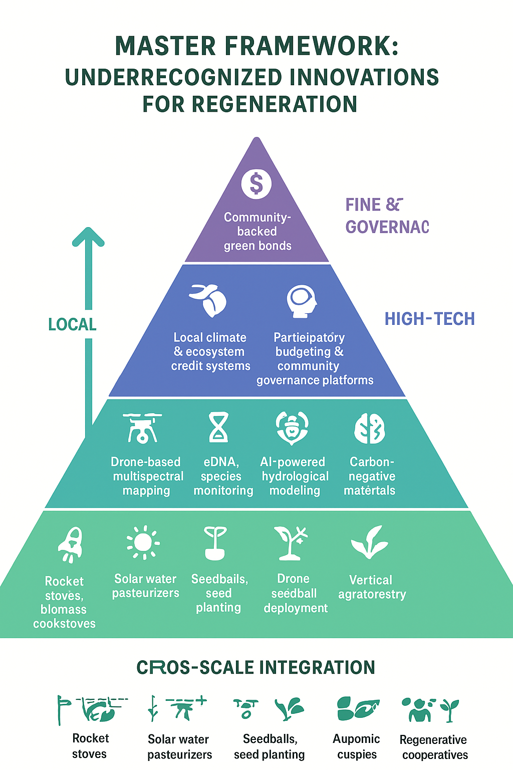 - Flow arrows: Show how innovations feed upward (e.g., seedballs → drones → AI restoration planning) and feedback downward (AI insights → community action → local implementation)